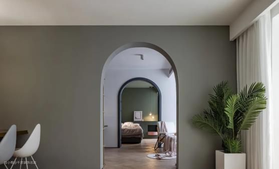 ▲ 弧形门洞搭配浅绿色墙面,辅以绿植,复古氛围跃然纸上。