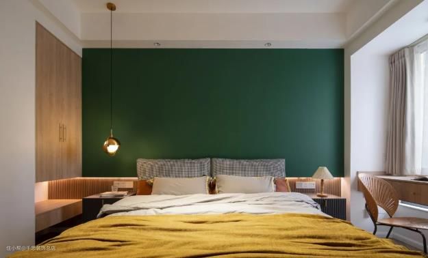 ▲ 复古绿床头背景墙和姜黄色家具,让这个卧室看起来既复古又温暖。