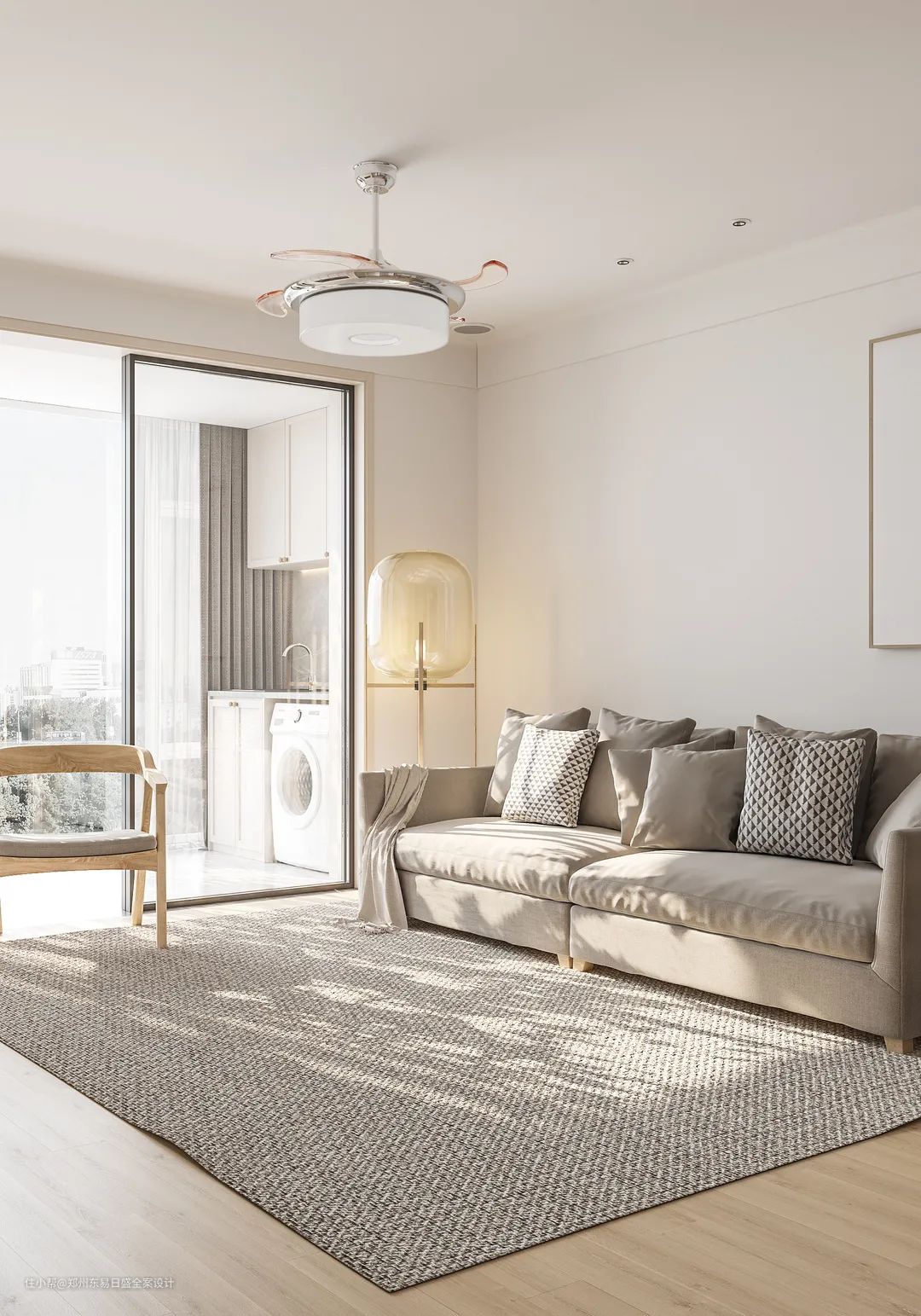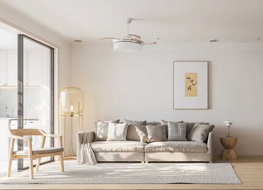 通透的光线营造柔和的视觉空间,配合米白色的墙面和温润的木地板,雅致清新的氛围感油然而生。亚麻材质的沙发、木质单人椅和简约落地灯的组合,简而不凡,舒适静谧。