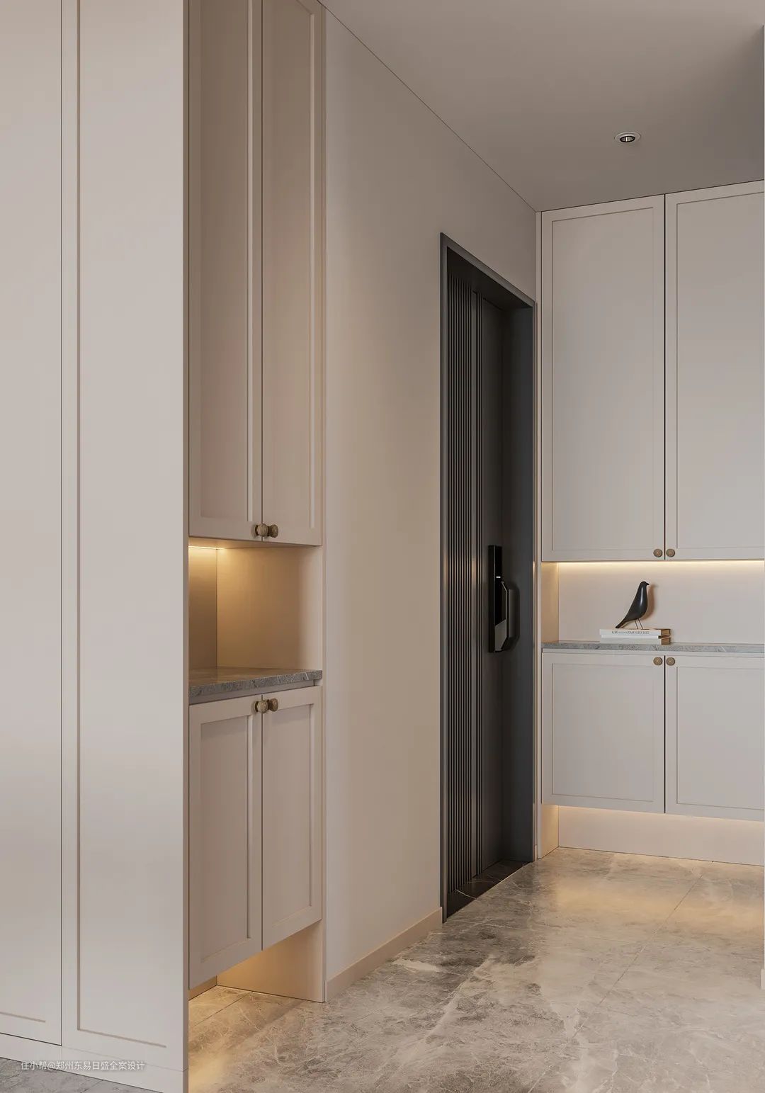 一进门,整片的米白色就点明了空间的主题。结合两侧墙体打造玄关柜,让归家之人卸下一身疲惫。柜体中间和底部掏空添加隐藏灯带,让边角区域也能足够明亮。