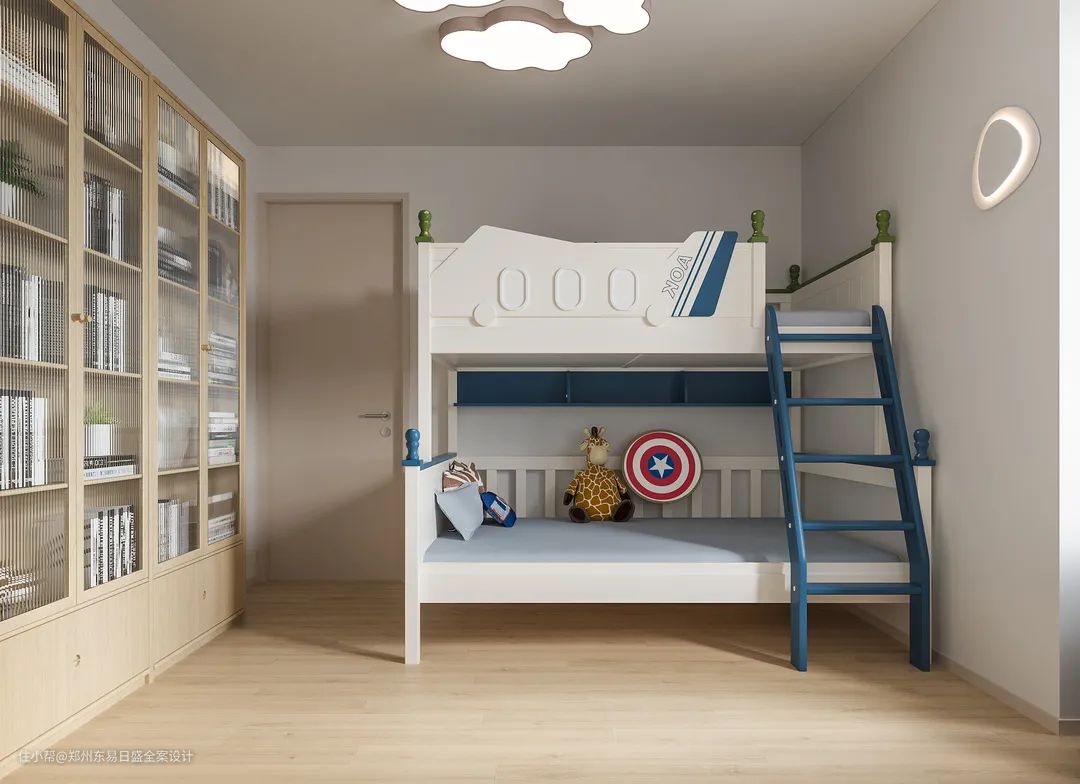 偶尔孙子会过来暂住,所以老两口直接将次卧改成儿童房,对于孙儿的宠爱溢于言表。卡通造型的高低床、云朵型吸顶灯以及毛绒摆件,营造出天马行空的童趣空间。