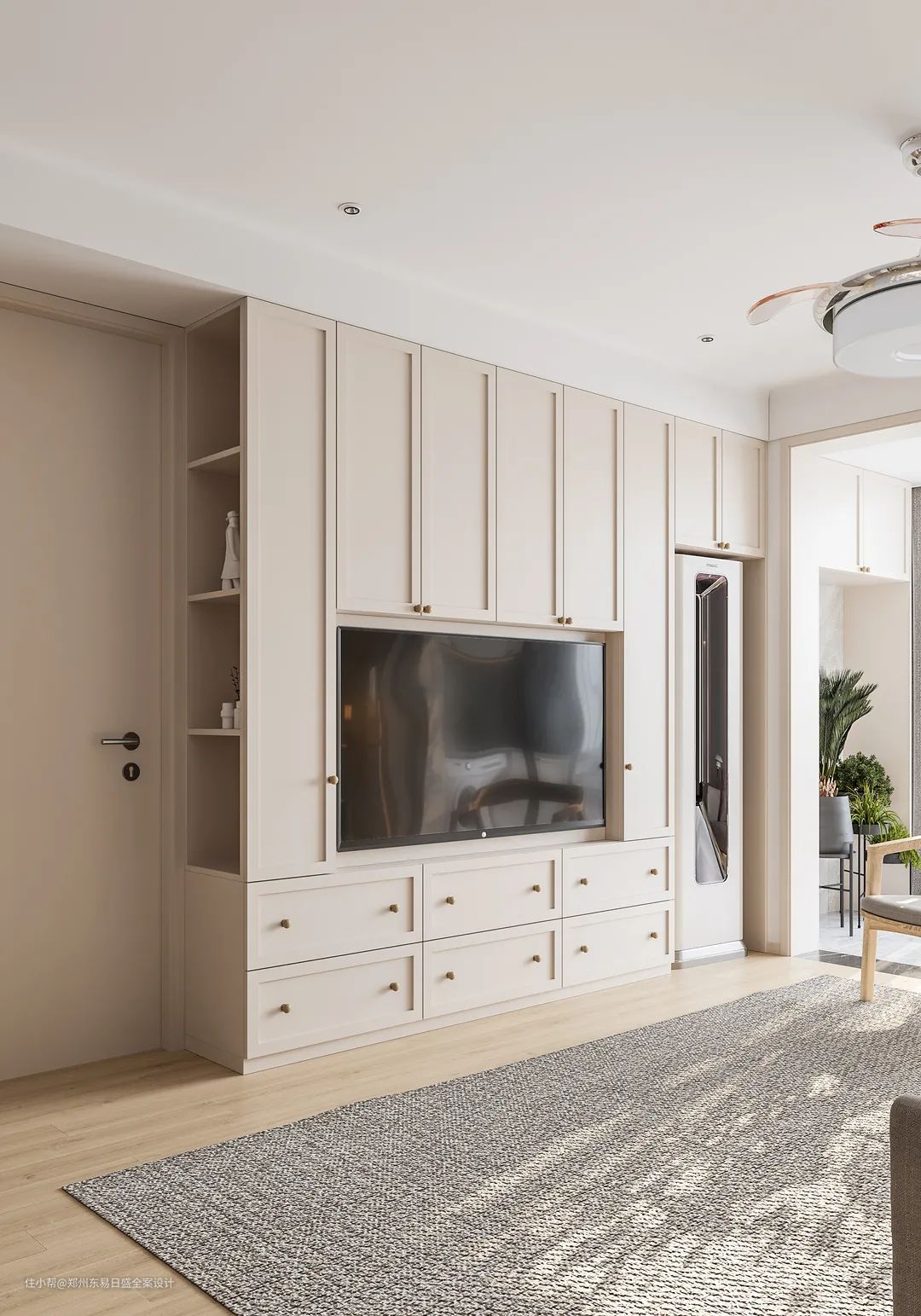 以整体橱柜做电视背景墙,嵌入式处理简洁大方又能保证其余空间的有效利用。侧墙掏空放置小摆件,收纳生活中的小美好。