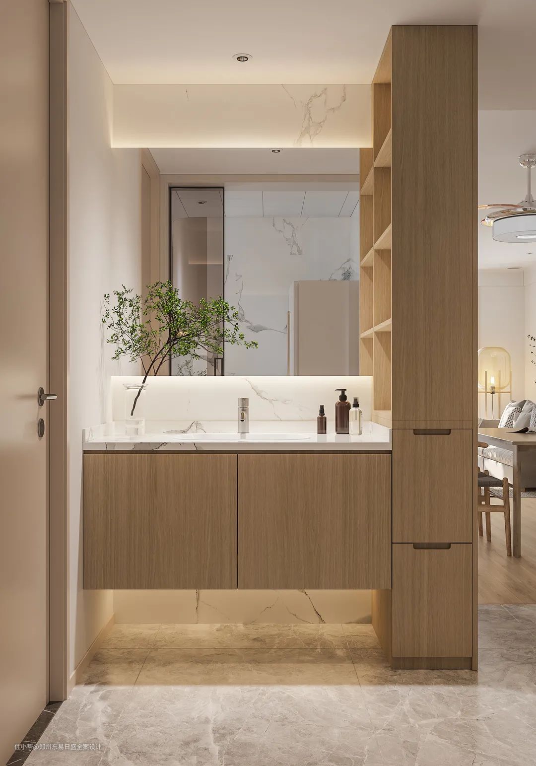 洗手台外置,提升了空间利用率。大理石墙壁和宽面镜搭配柔和的灯光,共同营造素雅精致的空间氛围。浴室柜留空,方便下方卫生清洁。