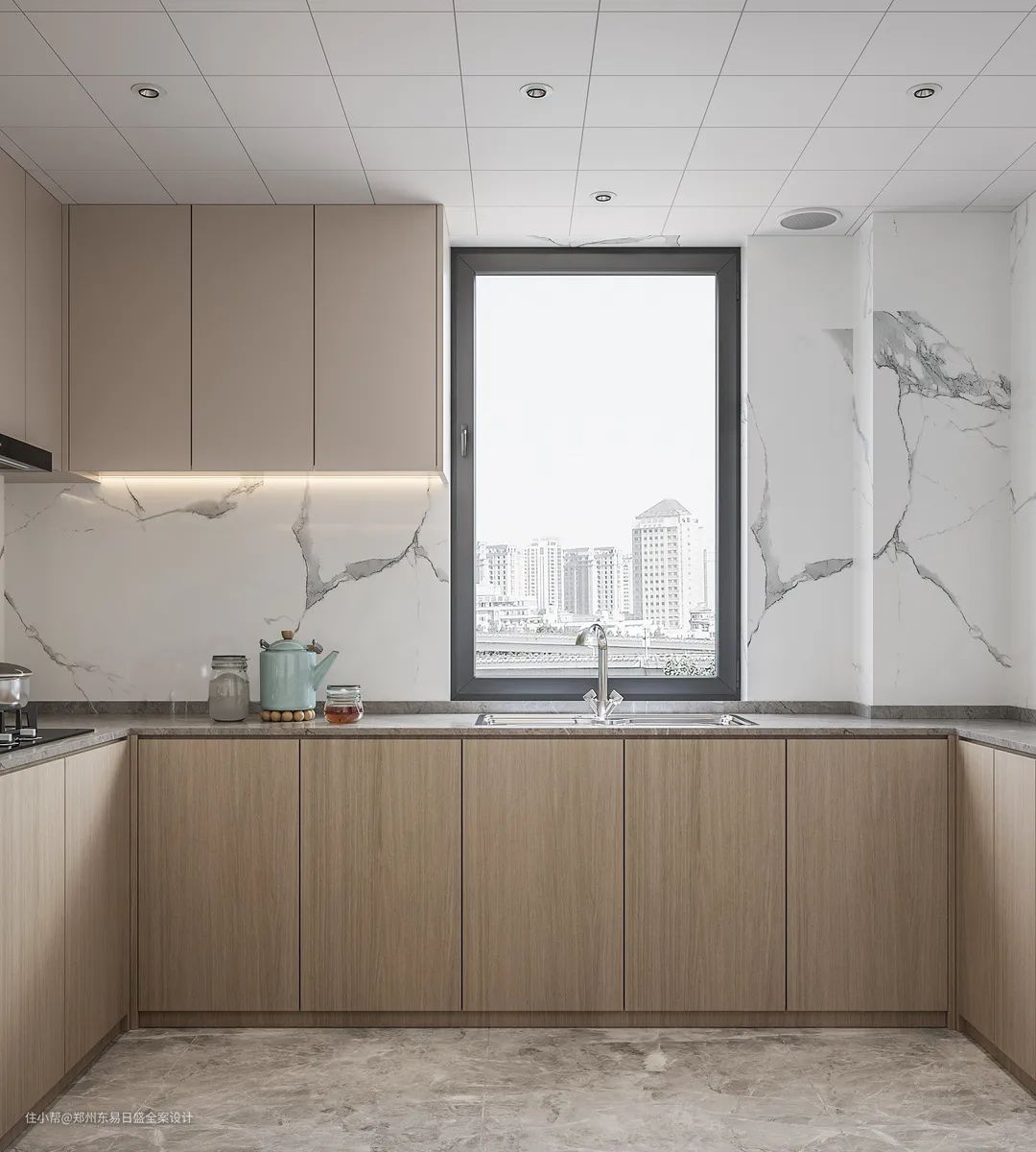 厨房采用U型布局,深色的地砖与大理石操作台更易于平时打理,原木色的柜体延续了客厅的主调,给烟火之地添加了几分素雅清秀的意蕴。