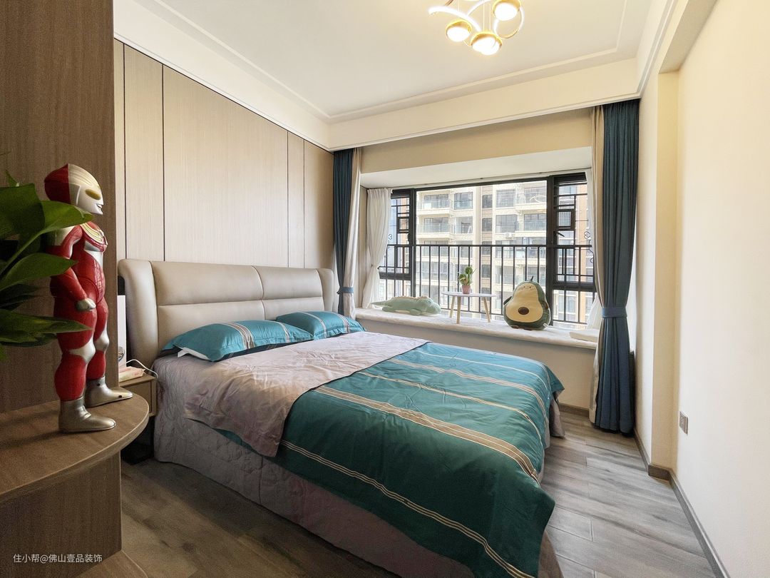 2.第二种情况是窗户在墙面中是竖向布局,这种的布局现在是比较常见的,这关系到了窗户两边剩余墙面的面积,所以窗户两边剩余的墙体不多,就是比较大的窗户,可以将窗帘直接做到两侧贴墙的位置,空间看起来整体性更强,简洁统一。如果两边剩余的墙体比较多,很多卧室的面积本身就不大,但是收纳置物一样不少,如果直接做满墙就有些浪费,窗帘直接装到跟窗户边上就可以了,其他空间可以布置家具跟落地灯等等。