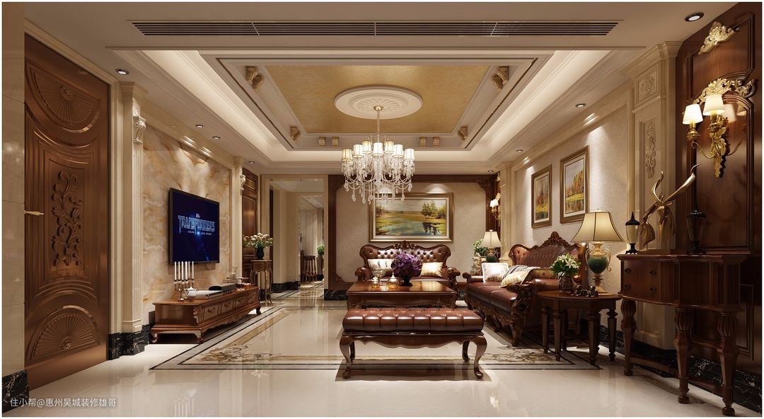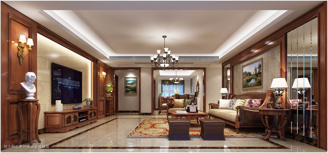 传统美式在硬装上多使用红木、墙纸,重点一般都在家具、以及装饰品上。家具的体型高大、线条对称,材质一般为木质,细节处会做雕花造型,结合皮质营造大气感。其中还会包含一些碎花的元素。装饰方面,花瓶、绿植、艺术摆件、装饰画是必不可少的。还会搭配一盏造型古典的吊灯。整体空间大气又有韵味。