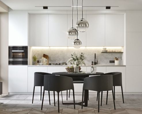 现代美式的色调较为自由,硬装也走简单路线,家具的体型虽然依旧高大,但线条简化很多,材质也不再局限于木质、皮质,家具整体给人感觉较为现代化,装饰方面也不再繁重,选择简单的装饰画、摆件等,就已经足够。