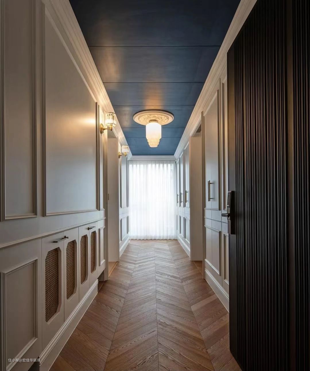 玄关是室内外环境的过度地带,最燃占地面积不大,但使用频率高,是进出住宅的必经之处。既可以划分空间来保护隐私,又可以满足日常换鞋收纳凳实用性需求。