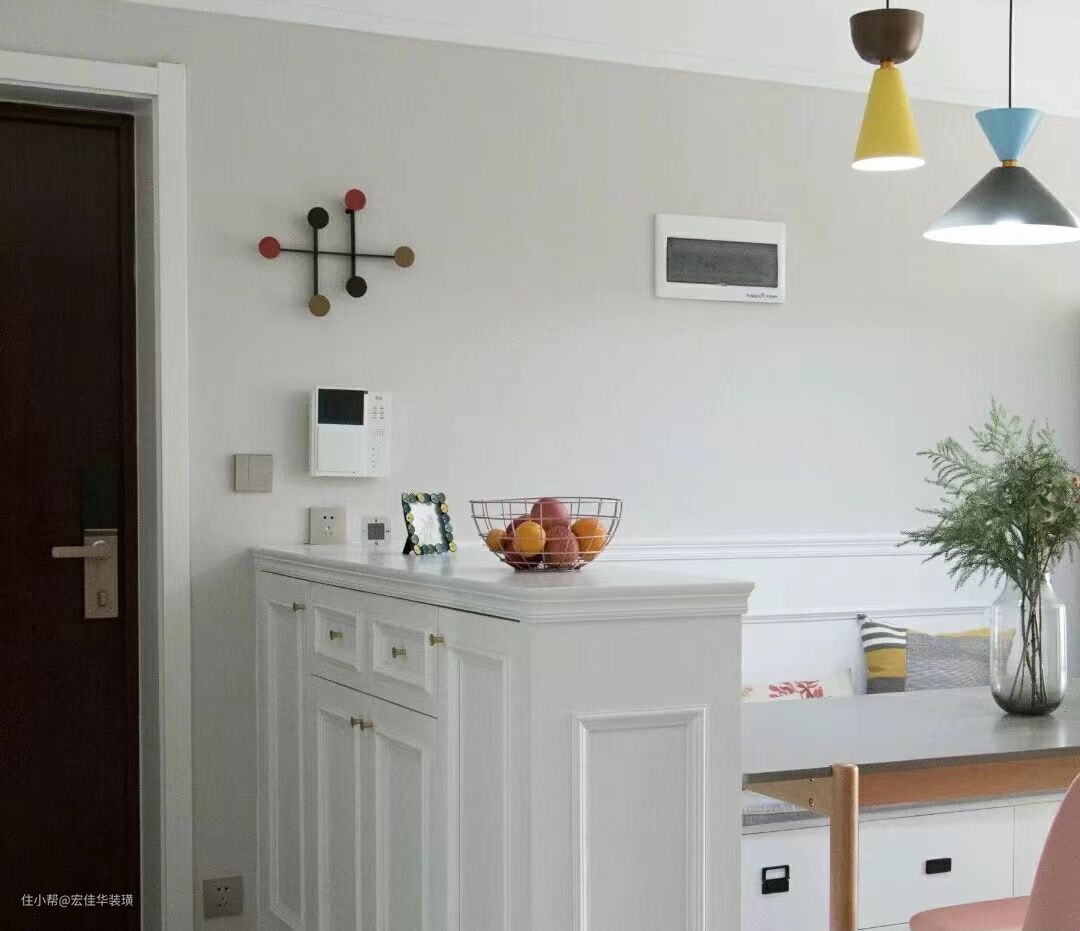 无玄关的户型常见的有两种,一种是入户大门在客餐厅中间的位置,另一种是入户门进来就是餐厅。