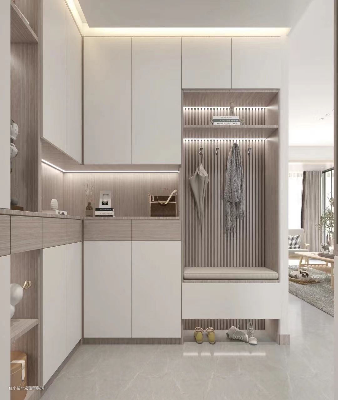 这种类型的玄关能够更加有效地保护隐私,也让室内更具有神秘感。将墙面空间利用起来,定制两面的L型玄关柜,集合挂衣区、挂包区、展示区、换鞋凳、台面收纳区等等。