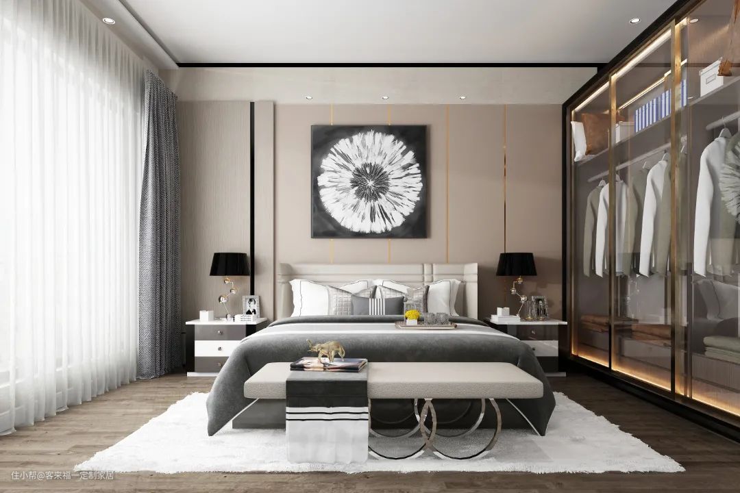 对于空间充裕的户型来说,我们可以尝试更具有设计感的衣柜来提高家居格调,如:L型衣柜、弧形衣柜或者开放式衣柜等。这样的衣柜设计在满足收纳本职功能的同时,主人还可以根据自己的审美需求进行再设计,打造出属于自己的专属空间,富有灵活性!
