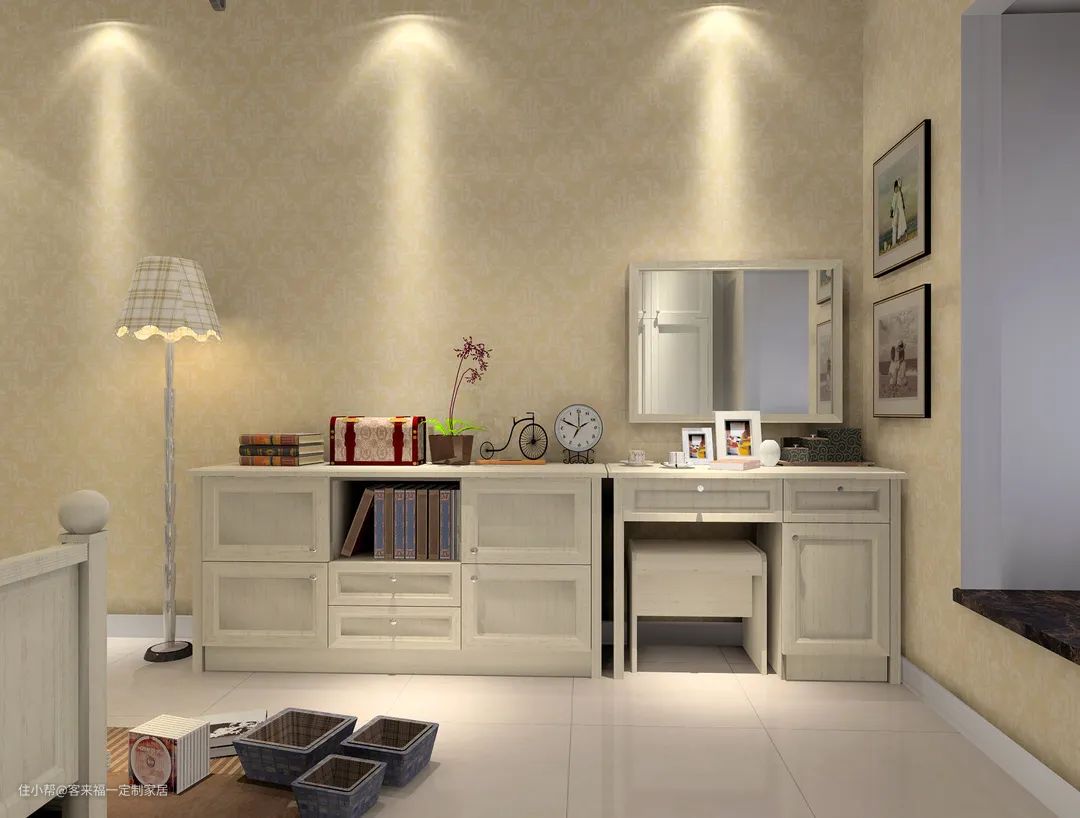 其次就是梳妆柜+衣柜的选择,梳妆台已经不再是女孩子的专属了,出门时的仪容仪表逐渐成为我们每一个人的必修课,对于家庭空间有限、装修费用有限的家庭而言,梳妆台、衣柜一体化会是一个不错的选择!我们将衣柜中部掏空,嵌入一个小型梳妆台来满足日常打理妆容的需求,大大提高了空间的使用效率。