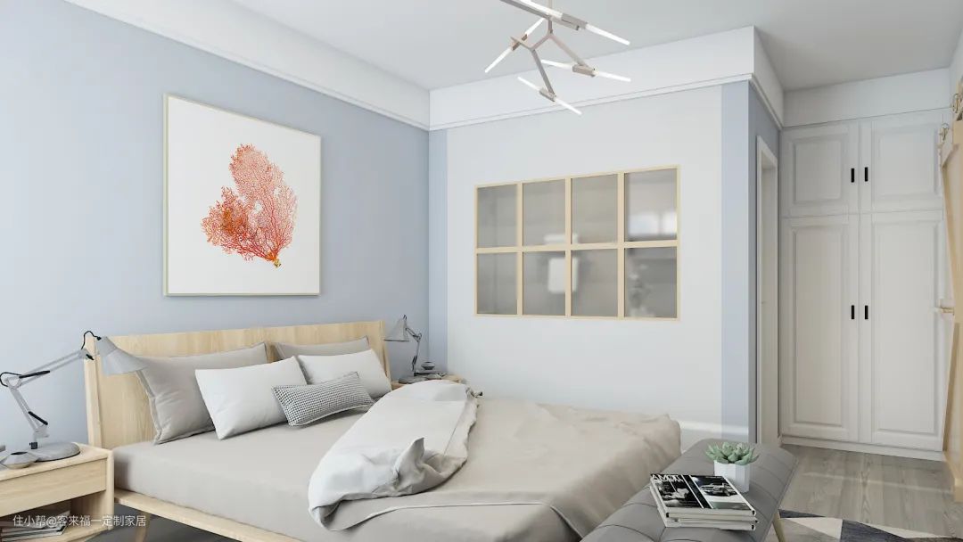 对于常见的小户型而言,可以将衣柜放在入户门侧,与床平行,这样的设计不会占据多余的卧室空间,简洁明了、线条清楚。如若家里的这面墙并不是承重墙,客来福建议您选择入墙式衣柜,提高空间的利用效率。