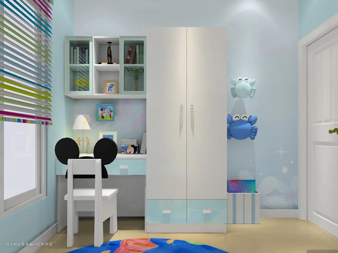 最后就是书桌柜+衣柜的选择,这样的一体化设计是儿童房空间设计的热门选项。兼顾到孩子学习、娱乐及各种物品的收纳,宽敞的空间成为最大的向往!客来福设计师让衣柜搭配上书柜,一半学习、一半储物,将实用性贯彻到底。