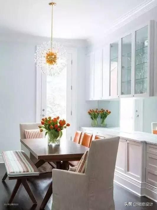 深灰色的餐布、红色的餐垫、黑色的餐具、白色的花瓶,空间丰富而迷人,黑色的烛台、红自相间的地毯、灰色的餐桌椅,空间则显得格外精致,不妨慢慢探索一下红、黑、白、灰的组合搭配,它们会给你不少惊喜。