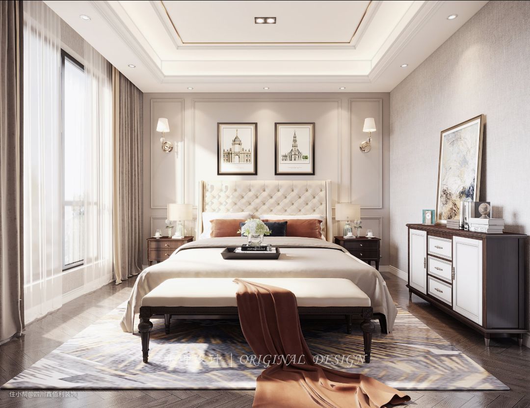 主卧的设计却不囿于任何一个空间的风格,复古的线条与简约的材质恰到好处,厚重与轻盈,沉稳与灵动,打造平衡美感。
