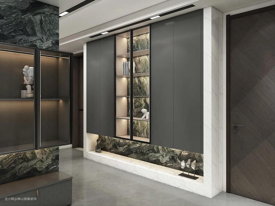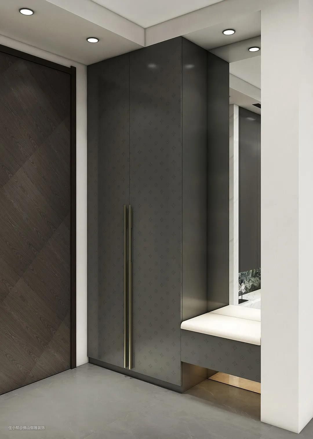 没有繁琐装饰,低饱和度色彩和极简化的造型,在保证充足收纳空间的同时,依旧保有简洁的视觉感。用阿尔卑斯绿来做局部跳跃,既丰富空间色彩视觉,又凸显时尚活力。
