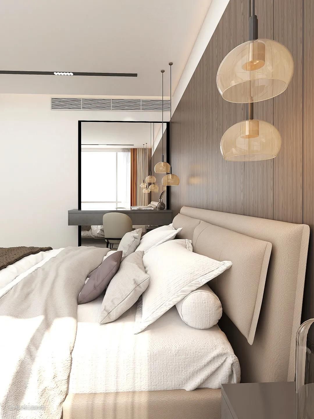 格栅化背景为卧室平添几许诗意,散发着抽象的艺术思维,是感性与理想,是意识与无意识的碰撞,最纯粹的初心,最纯粹的调性,没有丝毫张扬的姿态。