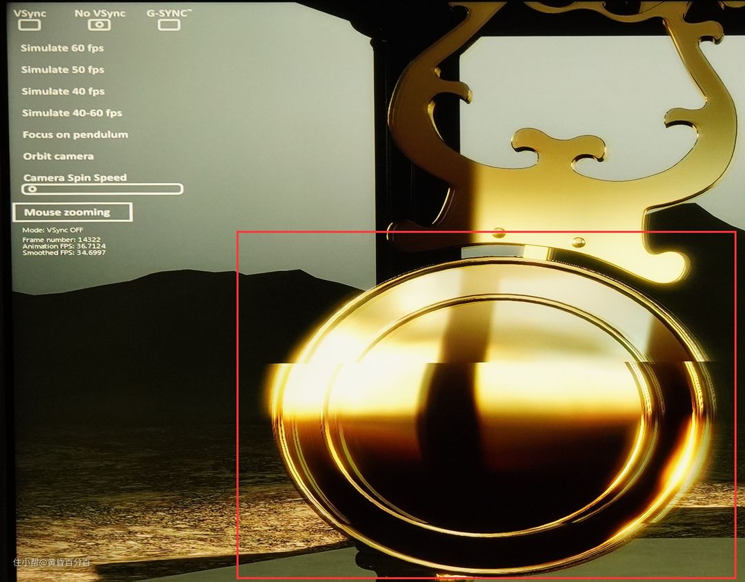 ▲开启VRR与不开启VRR的实拍比较,可以看到开启VRR的时候,钟摆测试画面流畅无撕裂,而关闭VRR后则有明显的画面撕裂。