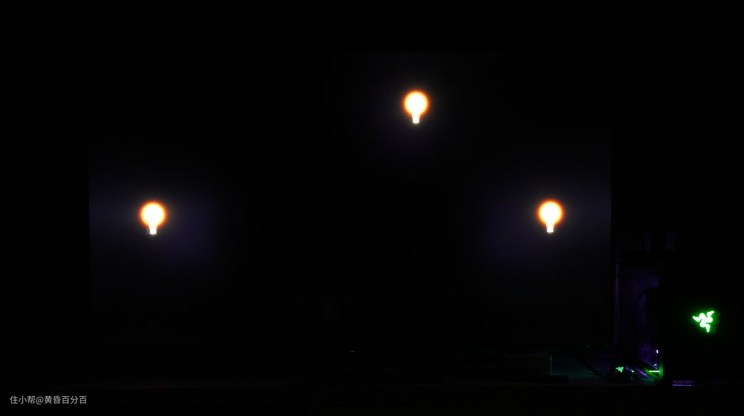 雷鸟65寸S535D共有90个独立的背光区域,理论上控光效果应该非常不错,至于实际表现如何,让我们用实际测试的结果说话吧,测试方式为背光测试专用的黑夜灯泡视频,我将会在全黑的室内进行屏幕的实拍: