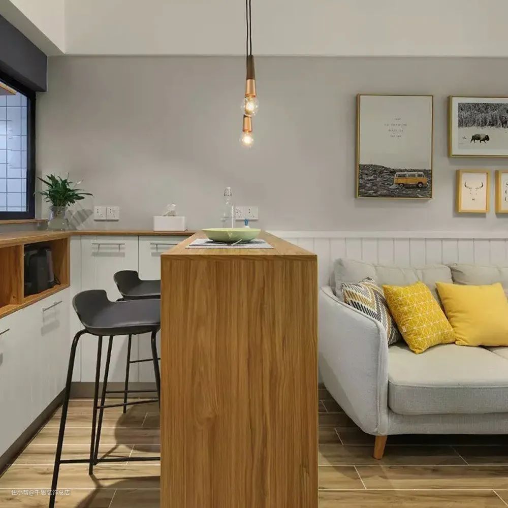 不同于大空间结合岛台,小面积的餐厅甚至没有餐厅的户型可以选择吧台餐桌,把餐桌与厨房结合,利用厨房与客厅一角,增加台面即可。对于喜欢开放式厨房的伙伴,尤其适用。
