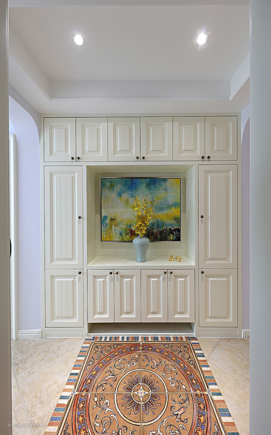 3.位于中央位置的玄关 如果玄关位于家居空间的中央位置,鞋柜可沿墙放置,保持开放式的格局,也能满足收纳需求,但要注意鞋柜不宜太高,否则会造成压迫感。中间的镂空位置放置装饰画摆件等,增加空间的生动性。