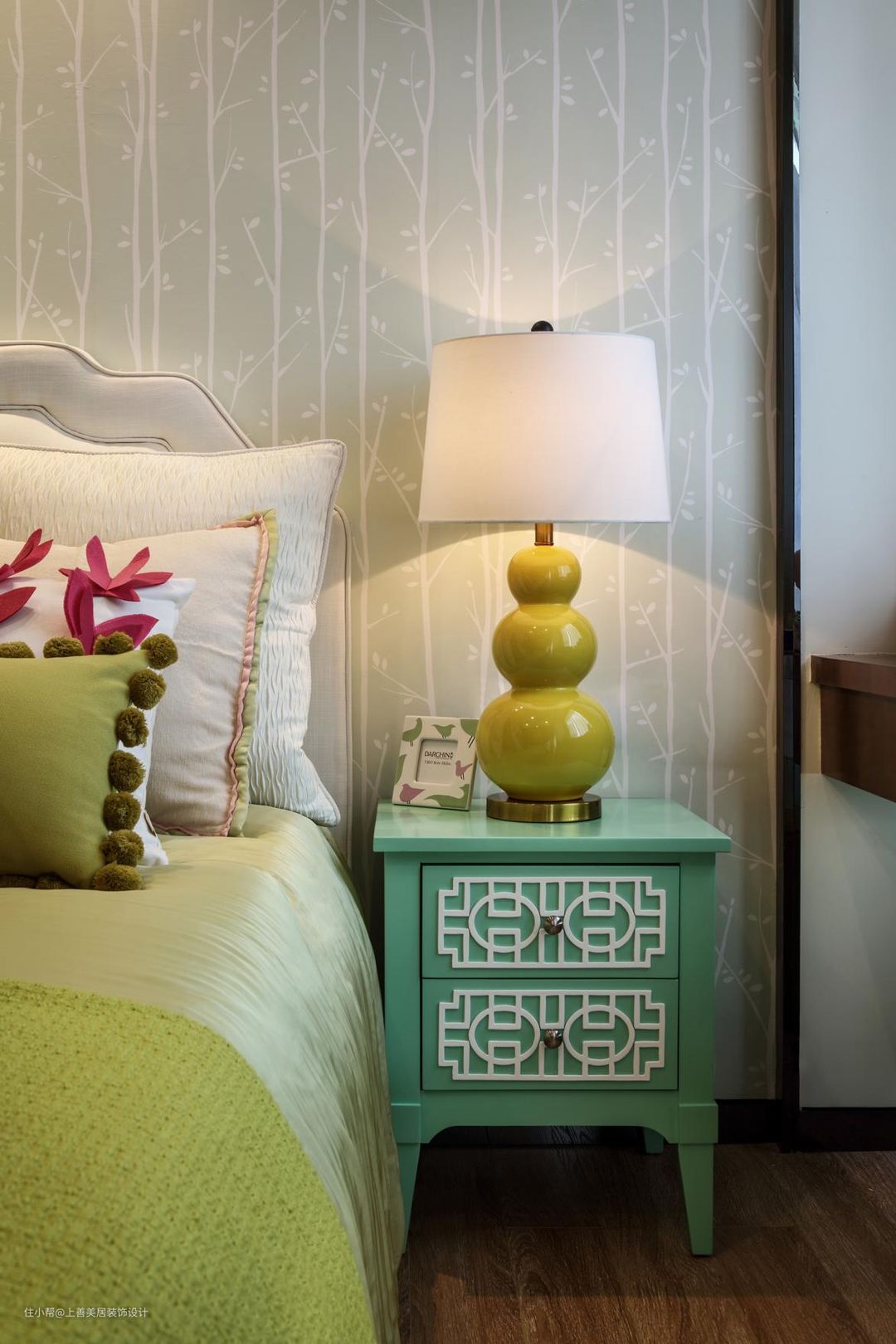 背景墙并没有设计过多的中式元素,而是贴上了一层壁纸,女孩子嘛,喜欢小浪漫,而上边搭配三个灯筒带来的氛围感就满足小女儿的小浪漫。