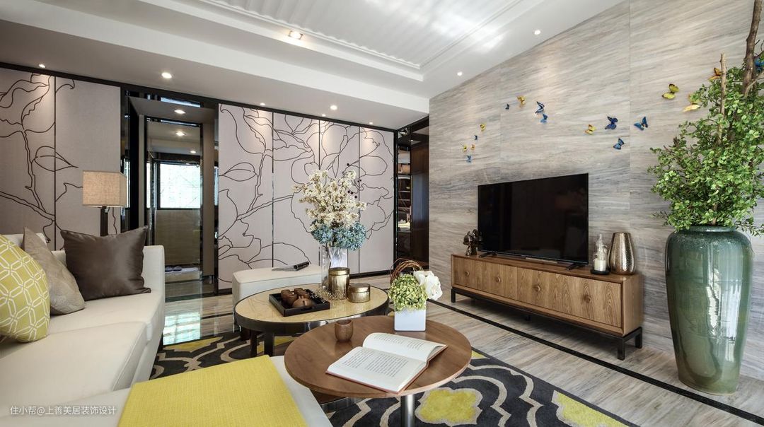 电视墙用的是与地面瓷砖相同的木质纹理,上面装饰的小蝴蝶也是整体视觉感不太单调。而木质的小茶几和大大的陶瓷花瓶也是给整个空间给予了几分原生态的气息。