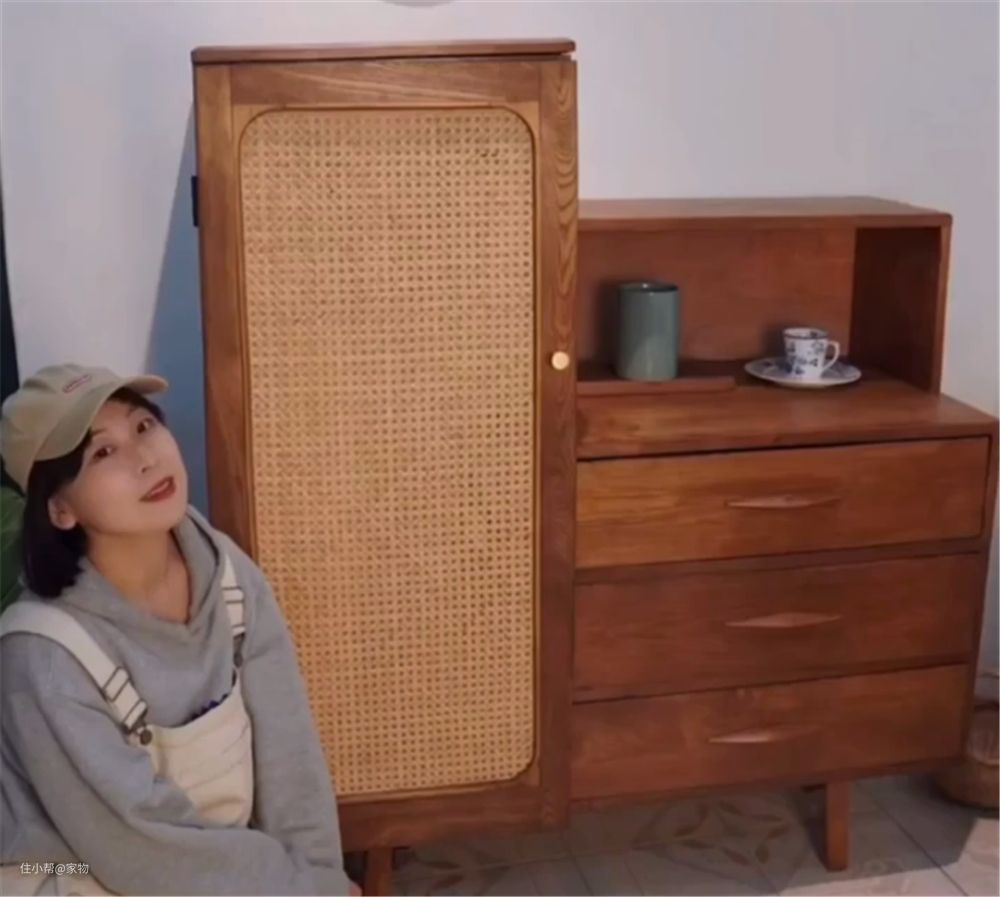 柜门上的木纹、铜制小把手、藤编柜门,都成为了这组柜子的点睛之笔,把它当做玄关柜、杂物柜、餐边柜都很合适,不得不让人佩服这位姑娘的手艺!