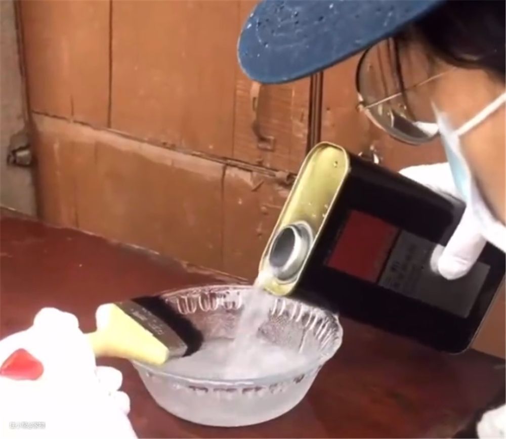 首先,姑娘买来了除漆剂,打算将柜子上老旧的漆面全部去除,重新上漆。