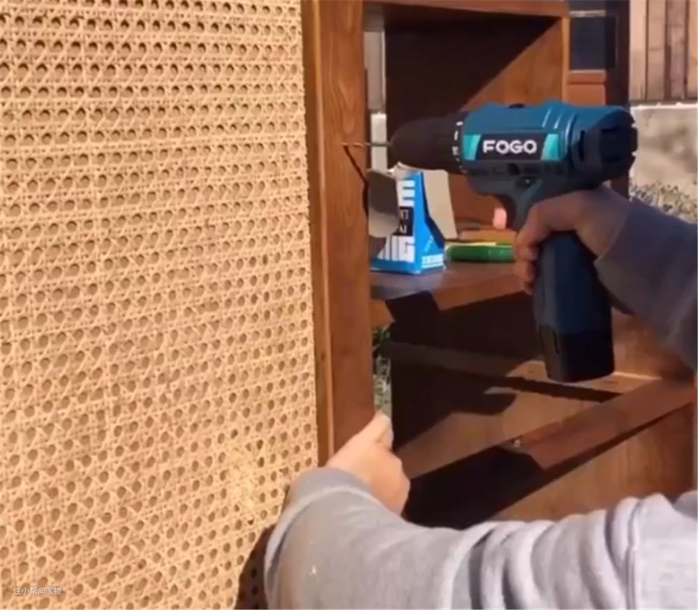 买来一张小的藤编网,代替原本柜门的木柜面安装上去,你别说,看上去真的有种小清新的感觉。