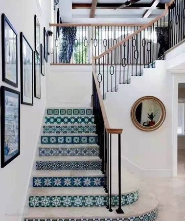 对于别墅或跃层来说,楼梯也是一个可以把平淡变得生动的地方。不过楼道区域铺贴小花砖就很考验设计能力了,设计好了会有一种高级的异域风情,非常吸睛。