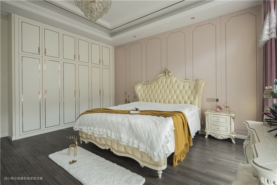 将床摆放在中间较为常见,床的周围不止需要留出能够过人的空间,还需要为整理床铺留出一定的空间。床与平开门的衣柜之间,要留出90cm左右的距离,推拉门与折叠门的衣柜,则只需留出50~65cm的距离,这个宽度包括房门打开与人站立时会占用的空间。如果想摆放床头柜,床头旁边留出50cm的宽度,可顺手摆放眼镜、手机等小物品。