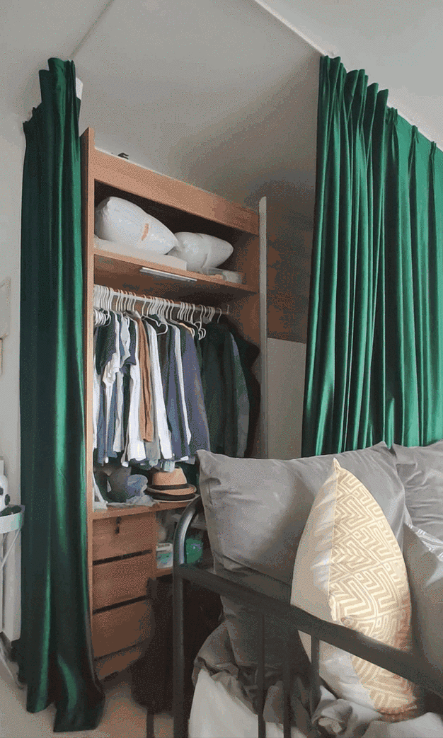 也可以打造开放式衣帽间,防止积灰用一个布帘解决问题。