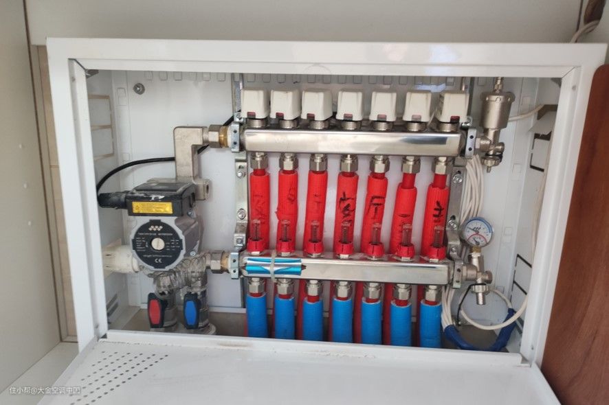 分集水器相当于整个地暖系统的水利枢纽站,是一个把主管道中的热水分成若干份,送到各个房间支管的分流装置。以8路为例,一套分集水器和连接主管所占用的空间为600mm*600mm*100mm(宽*高*厚),分集水器离地300mm,推荐隐蔽安装在阳台柜内、卫生间的台盆下,因为分集水器在后期使用中需要定期清洗维护,而这些区域一般都设有地漏,冲洗时能直接排出管道脏水,更为便捷。