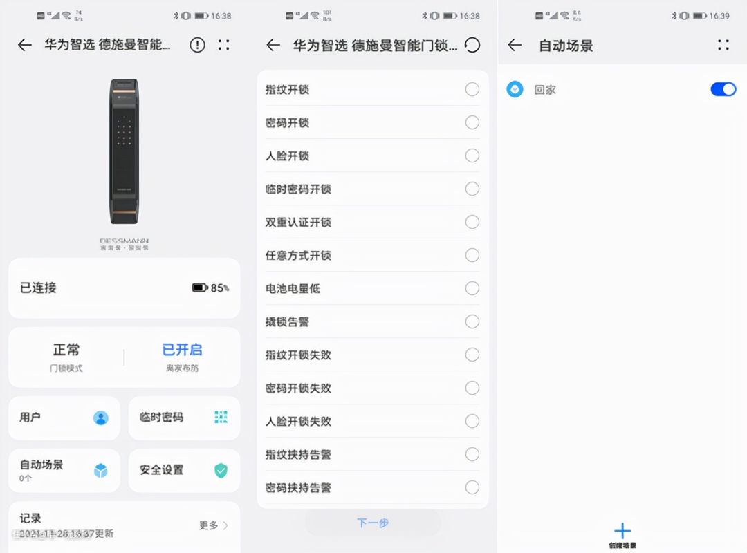 除此以外,智慧生活APP页面还提供了“自动场景”和“安全设置”,用户可以根据个人的需求进行设定不同开锁方式所对应的场景,方便记录。安全设置提供了多种选择项,如自动上锁、双重认证、接近感应、逗留检测、人脸挟持、感应时间等,安全方面极致放心。