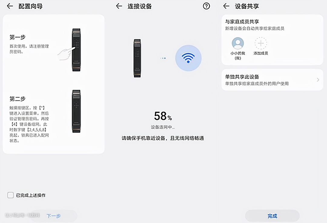 整个安装过程还是挺快的,安装完后就是通过智慧生活APP进行人脸、指纹的录入,输入默认的门密码及管理密码及可按提示录入人脸及指纹。当然这一切都要基于设备联网,通过智慧生活APP并配合门锁操作完成,使用非常简单。