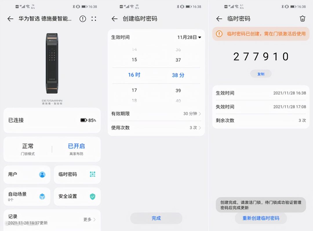 临时密码的功能还挺不错的,如果偶尔自己不在家时亲戚朋友来拜访,进不了门,还可以设置临时密码,临时密码使用后即失效,不用担心密码泄露风险。另外,临时密码进入后,手机会收到推送消息,让你知道有人进入,安全提醒设计的还是非常用心的。