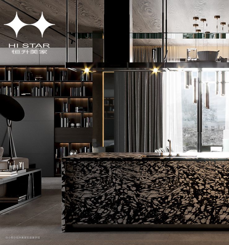 开放式厨房撞色大理石吧台与周围现代家居自然交织,将简练与轻奢风韵融入到整个空间内。