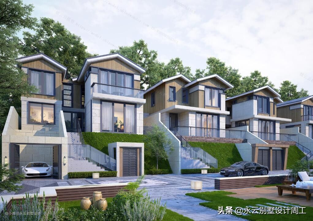 与联排别墅相比,叠拼别墅的独立面造型更丰富一些,其下层别墅通常具有“接地”特色,有半地下室,拥有独立花园,让住户足不出户就能享受到回归自然田园的快乐;上层别墅则具有“透天”特色,拥有大面积屋顶平台或露台,为赏风观景提供了绝佳的场所。同时又将上下两个别墅的外立面、屋顶造型等,按照一栋独立式住宅的立面效果进行整体考虑,保持外观上的统一性与连贯性,从而形成整体和谐完整的景观效果。
