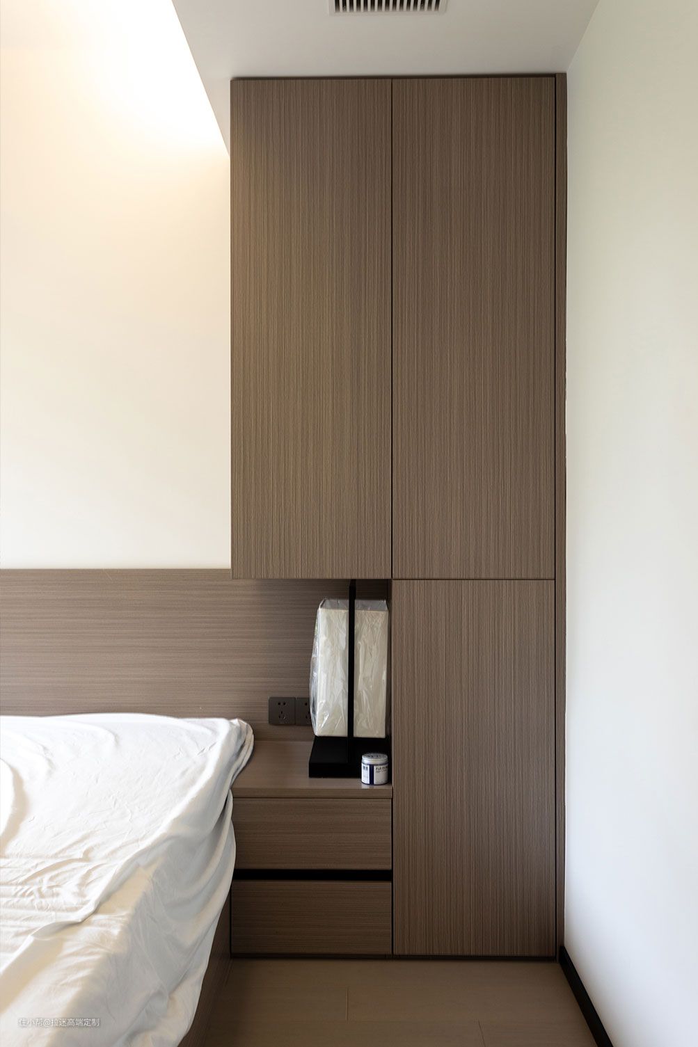衣柜的设计比较精巧,由于空间局限,没有办法放置床头柜,于是在衣柜上空出一格来,把空间运用到了极致。