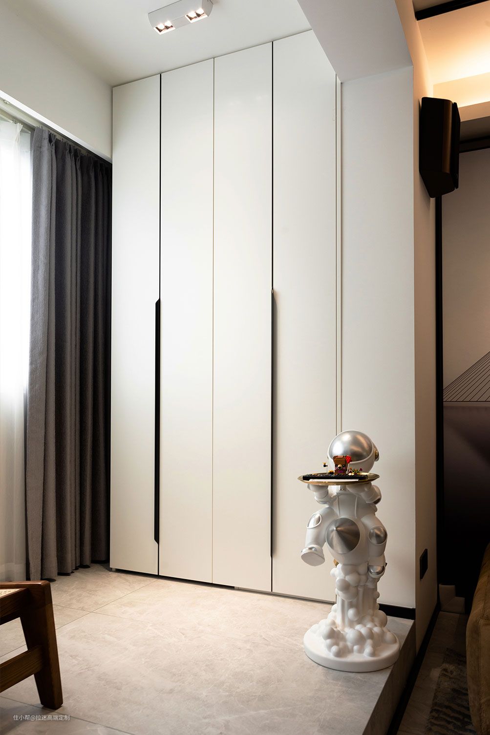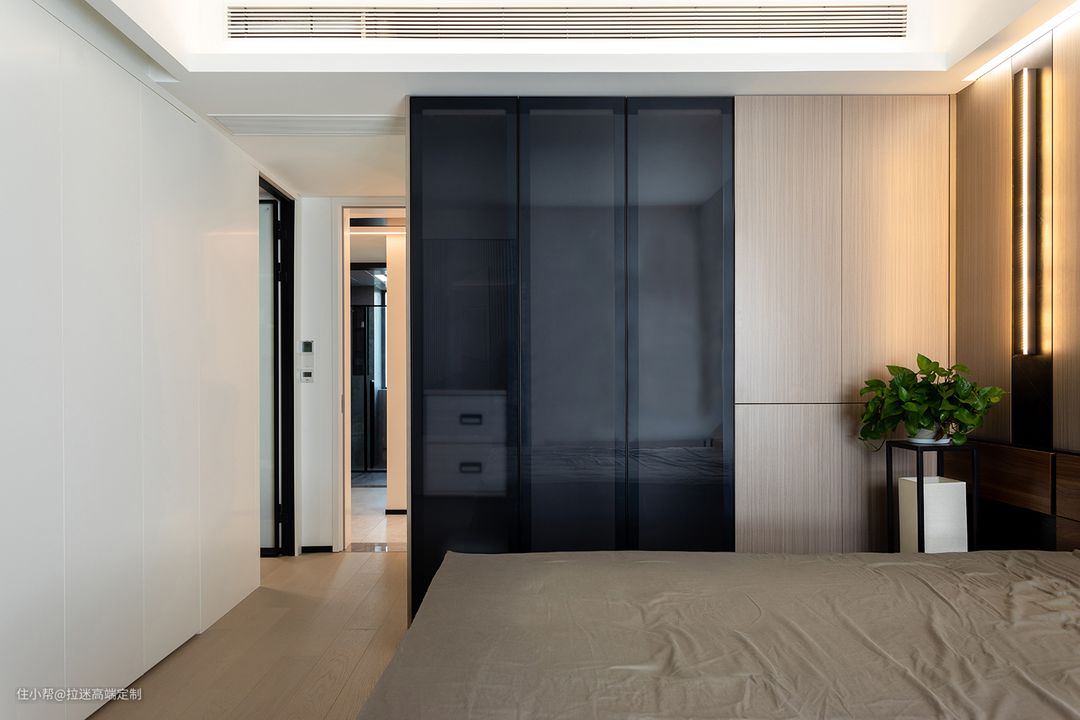 衣柜的材料选用的是灰玻玻璃门,和澳松板科技细杉木,两者组合在一起,使衣柜显得更有质感。灰玻玻璃使衣柜里面的衣服达到一种透而不露的效果。
