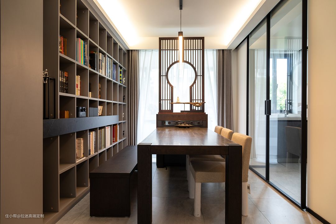 妻子偏爱中国风,所以餐厅用中国风的屏风做了隔断,展柜上摆放了木艺雕刻摆件,非常典雅有韵味。