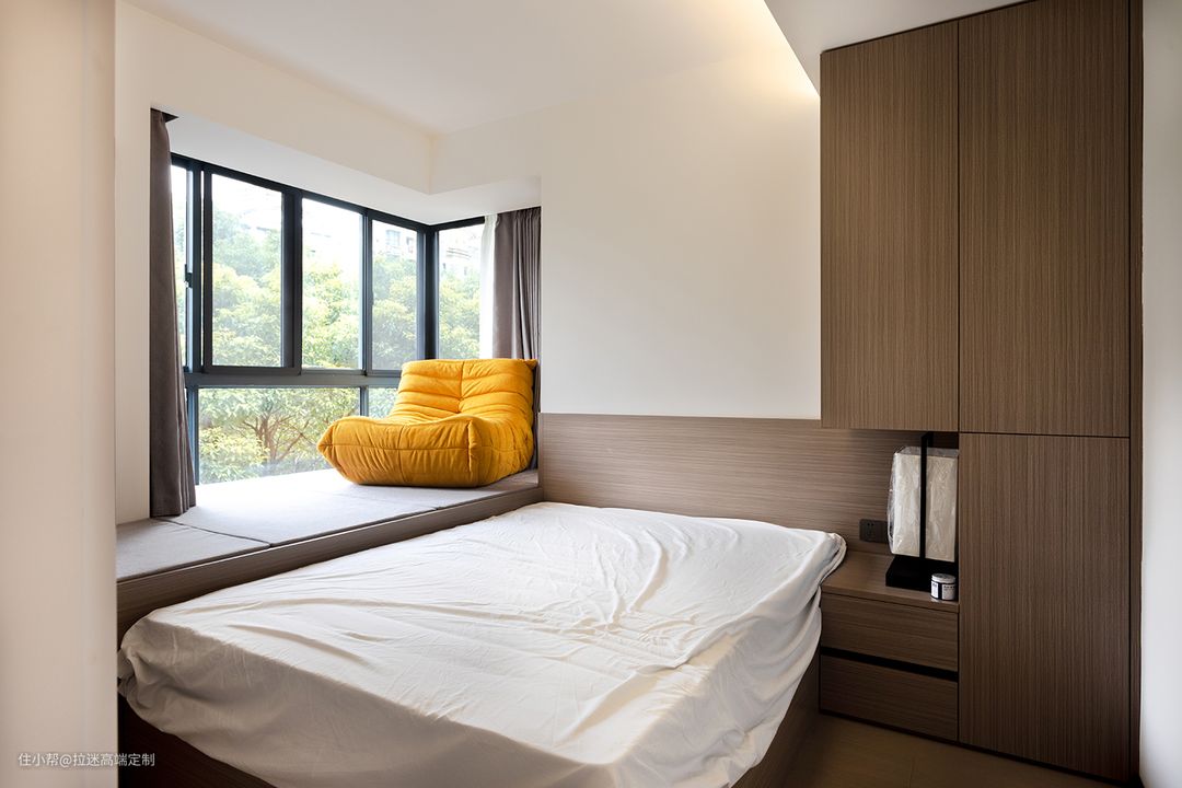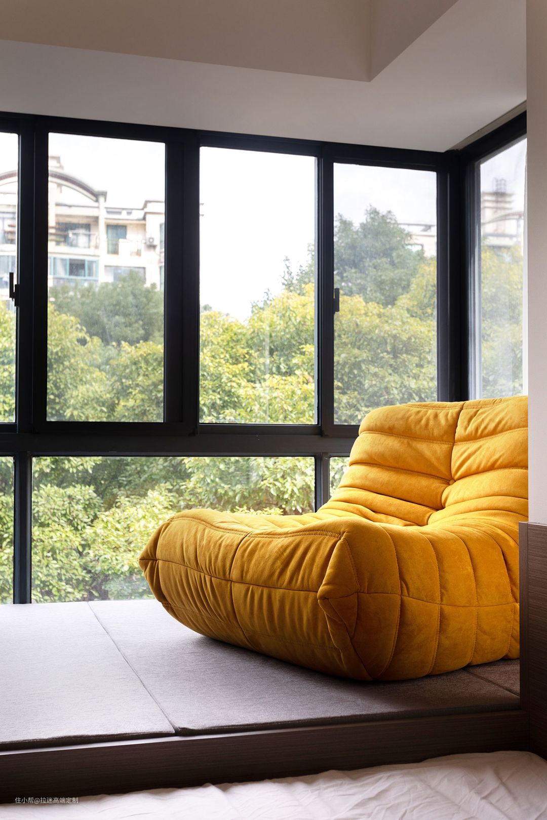 客卧的装修比较简约,飘窗上放的毛毛虫沙发,可以坐在上面放空自我。
