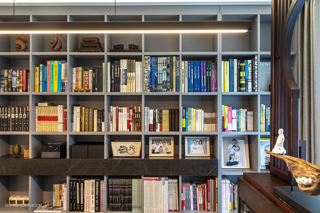 餐桌不仅仅用来吃饭,旁边的展示柜除了摆展览品也放了很多书,周末一家人在餐桌上看书学习,陈先生在餐桌上做设计图,从小培养女儿阅读的习惯,这样的设计拓宽了其使用的可能性。