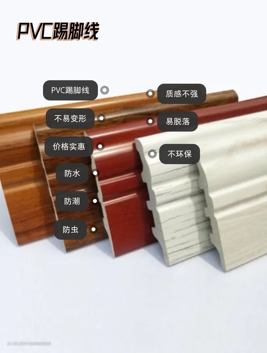 市面上很多卖木地板的都会送PVC踢脚线,一般送的PVC踢脚线质量不怎么样,后期容易脱落,质感不怎么样,用手敲里面是空空的,当然也有实心的PVC踢脚线,那种质感会好些,如果选PVC材质的踢脚线就选实心的,毕竟PVC材质有优秀的防水、防潮、防虫、不易变形的优秀属性,但是一般家装不建议选PVC的踢脚线。