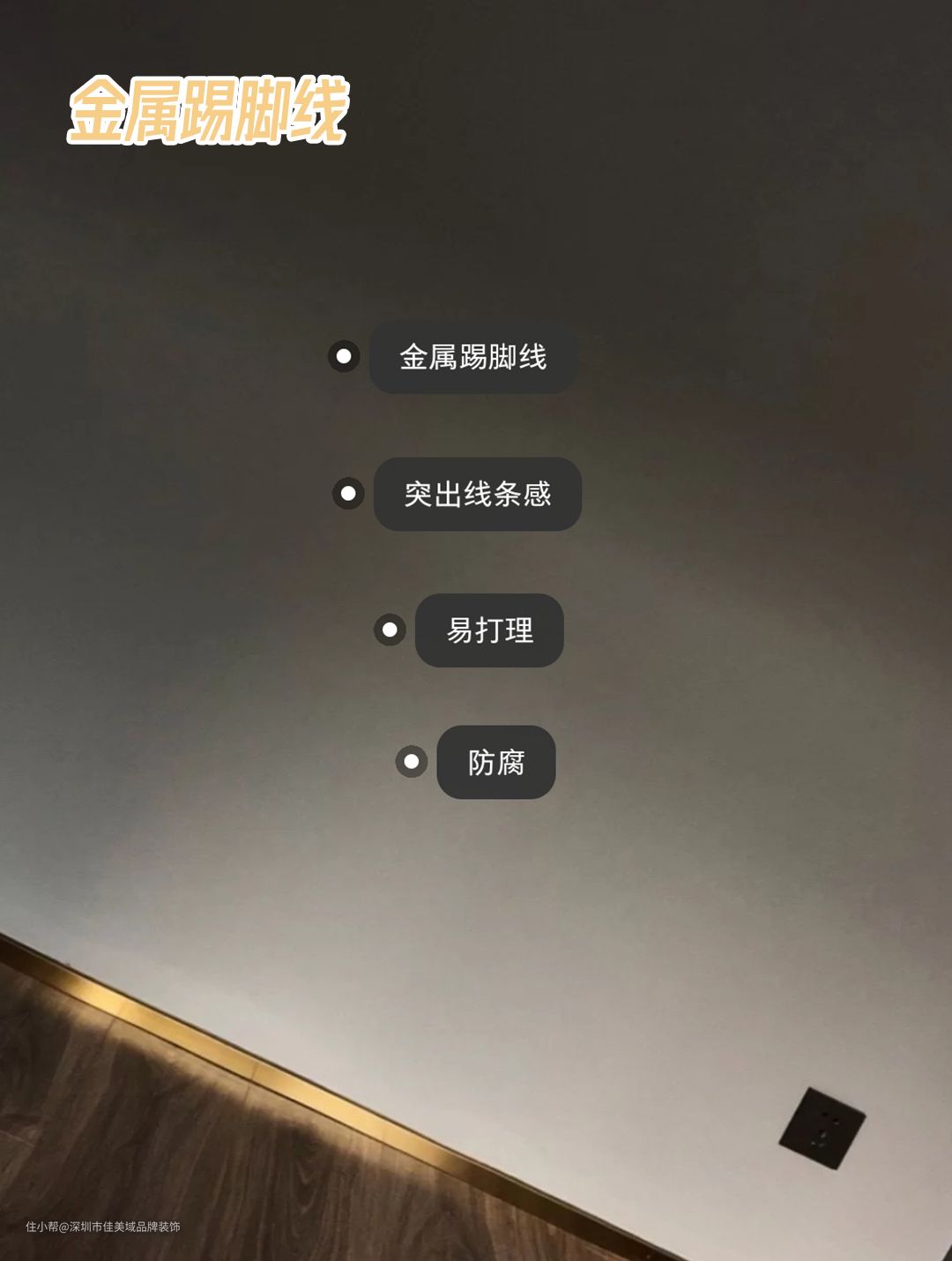 一般用于现代、轻奢、极简风格里,很多高档酒店装修也会用到,可以很好的凸显房间的线条感,提升整个装修档次,一般用钛金为主要的材料,有4cm、6cm的金属踢脚线,4cm的更能凸显线条感。用金属踢脚线一般成本也会高很多,但是装修出来的效果是其他的材料替代不了的。