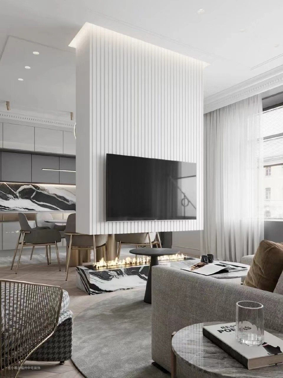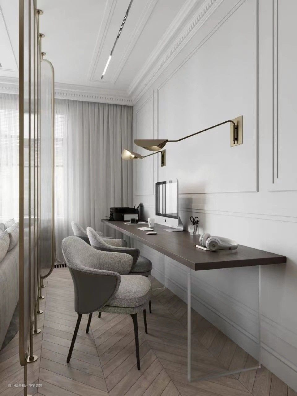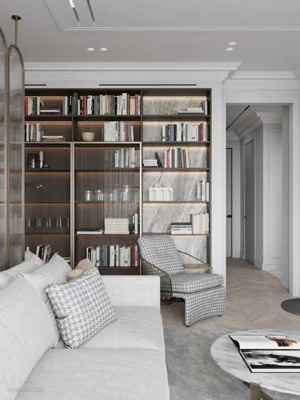 客厅沙发背景加入7道金属+长虹玻璃的椭圆造型屏风,后方书桌布置若隐若现的效果,感受到了一种轻奢优雅的高级。