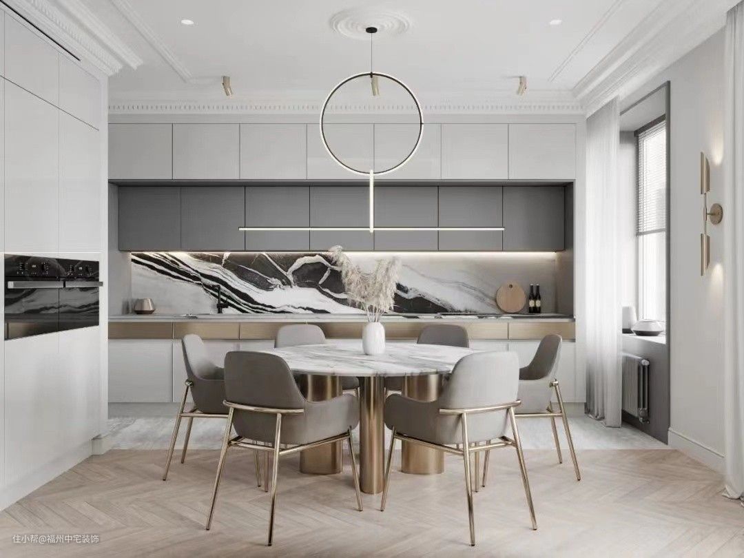 餐厅与客厅保持一种的淡雅色调,右侧装上烤箱,镶嵌在墙里面,整体美观;中间布置金属脚架的大理石台面餐桌,结合灰色皮艺餐椅,也让用餐空间显得实用华丽又端庄。