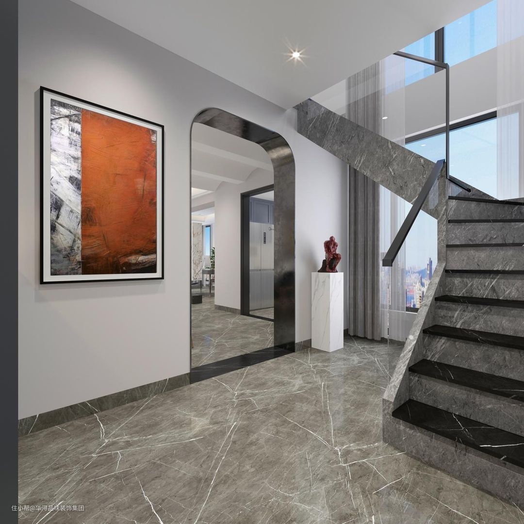 楼梯扶手以钢化玻璃组成,空间更显通透明亮,不显笨重。前往客厅的室内门做了包边的设计,上方是弧形拐角,营造一种温馨的感觉。墙面上还配有现代抽象画,砖红色的色调非常鲜艳明亮。